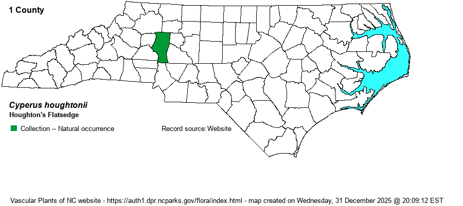 | Distribution | A single record, the specimen label merely stating "N.C." The specimen is correctly identified, but experts have annotated it with "Not likely collected in N. Carolina." This record apparently refers to Iredell County, as the USDA website shows this county of occurrence. Weakley (2020) does show this species as native in NC, as occurring in the Piedmont.