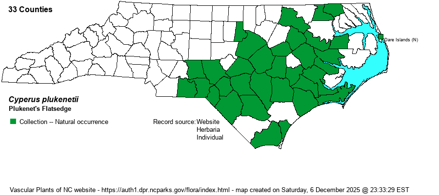 The genus Cyperus is mostly tropical and warm-temperate in distribution; thus, in NC it is much commoner in the Coastal Plain than in the Mountains and Piedmont. Most species have 1-few flowering stems (culms) from grasslike basal leaves, plus a few stem leaves. At the summit is an inflorescence of very open and branched, or tightly packed, spikes, varying among species from brown to golden brown to straw-color to reddish. The arrangement of the spikelets is important, whether like a hand (digitate) or in paired or alternate rows (pinnate); as is the shape of the achene (seed), whether bi-convex in cross-section or triangular. As a group, Cyperus tends to be weedy and readily enters disturbed ground; this is true for many natives as well as all the aliens. In recent years, following DNA research, the genus has incorporated several genera that in RAB (1968) or other manuals were separate: Hemicarpha, Lipocarpha, and Kyllinga. | |