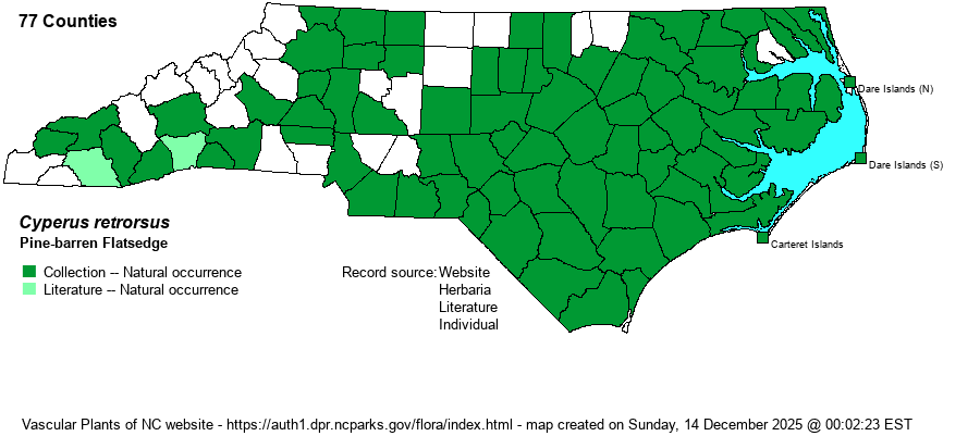 The genus Cyperus is mostly tropical and warm-temperate in distribution; thus, in NC it is much commoner in the Coastal Plain than in the Mountains and Piedmont. Most species have 1-few flowering stems (culms) from grasslike basal leaves, plus a few stem leaves. At the summit is an inflorescence of very open and branched, or tightly packed, spikes, varying among species from brown to golden brown to straw-color to reddish. The arrangement of the spikelets is important, whether like a hand (digitate) or in paired or alternate rows (pinnate); as is the shape of the achene (seed), whether bi-convex in cross-section or triangular. As a group, Cyperus tends to be weedy and readily enters disturbed ground; this is true for many natives as well as all the aliens. In recent years, following DNA research, the genus has incorporated several genera that in RAB (1968) or other manuals were separate: Hemicarpha, Lipocarpha, and Kyllinga. | |