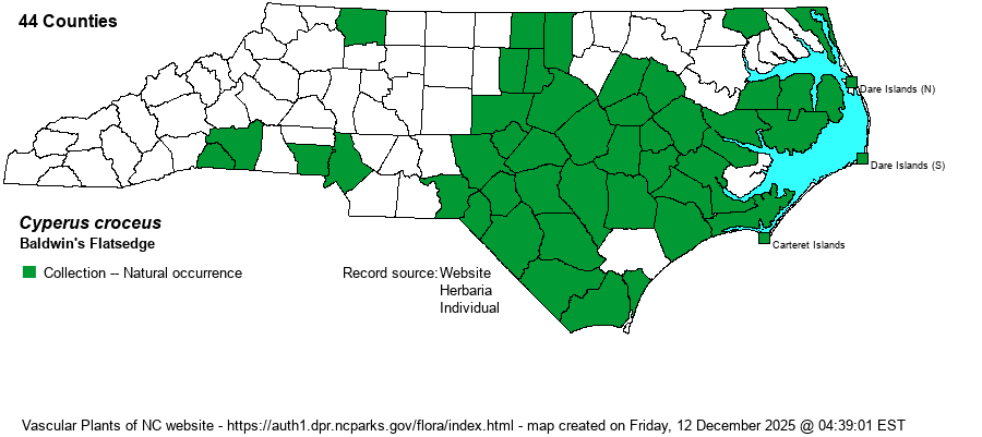 | Identification | The globular heads are usually distinctive, as few other Cyperus have that shape. Cyperus echinatus also has rotund heads, but they are compact and dense (vs. relatively open in C. croceus). Floral scales of C. croceus are whitish with red speckles (vs. straw colored or brownish in C. echinatus). | |