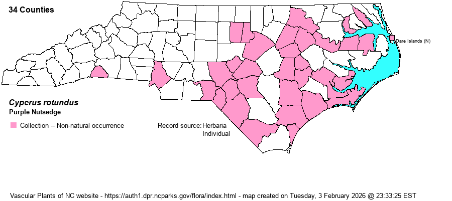 | Taxonomic Comments | The genus Cyperus is mostly tropical and warm-temperate in distribution; thus, in NC it is much commoner in the Coastal Plain than in the Mountains and Piedmont. Most species have 1-few flowering stems (culms) from grasslike basal leaves, plus a few stem leaves. At the summit is an inflorescence of very open and branched, or tightly packed, spikes, varying among species from brown to golden brown to straw-color to reddish. The arrangement of the spikelets is important, whether like a hand (digitate) or in paired or alternate rows (pinnate); as is the shape of the achene (seed), whether bi-convex in cross-section or triangular. As a group, Cyperus tends to be weedy and readily enters disturbed ground; this is true for many natives as well as all the aliens. In recent years, following DNA research, the genus has incorporated several genera that in RAB (1968) or other manuals were separate: Hemicarpha, Lipocarpha, and Kyllinga. | |