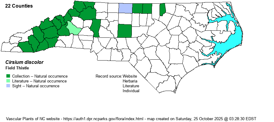 | Identification | This is a tall thistle quite similar to Tall Thistle (C. altissimum) in general appearance; it often reaches 4-6 feet tall. The purple-pink heads are numerous and rather large, about 25-35 mm high, as with that species. It can be separated from that species by its deeply dissected leaves, cut almost to the midrib. Swamp Thistle (C. muticum) is also a tall species with dissected leaves, but the spines on the involucre bracts are extremely short or lacking, but these bracts are quite sticky, whereas the bracts are spiny (over 1 mm long) and not sticky in C. discolor. | |