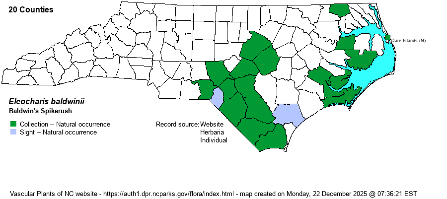 | Identification | Baldwin's Spikerush is a very small and slender plant, normally 2-6 inches tall, connected via runners and forming patches or a turf. The spikelets are narrowly ellipsoid and appear to be laterally compressed, 2-9 flowered. It may be confused in the field with E. acicularis, but that species has flowers arranged spirally (vs. distichously), and its seeds have many horizontal lines and have much smaller tubercles. | |