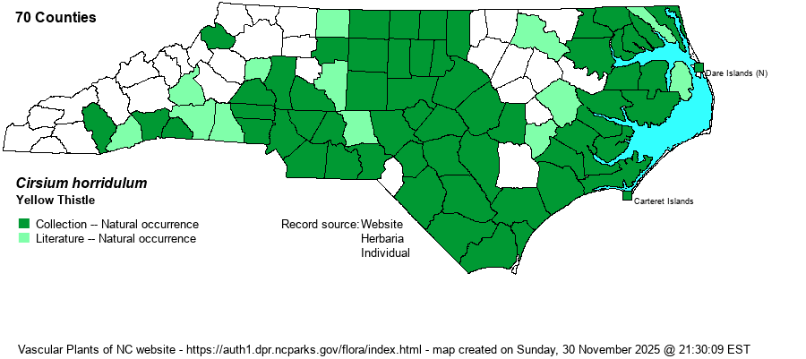 | Taxonomic Comments | RAB (1968) named this species as Carduus spinosissimus. Weakley (2018) lists two varieties in NC -- var. horridulum and the rather rare var. vittatum. The former C. smallii has been included within C. horridulum, as C. horridulum var. vittatum.