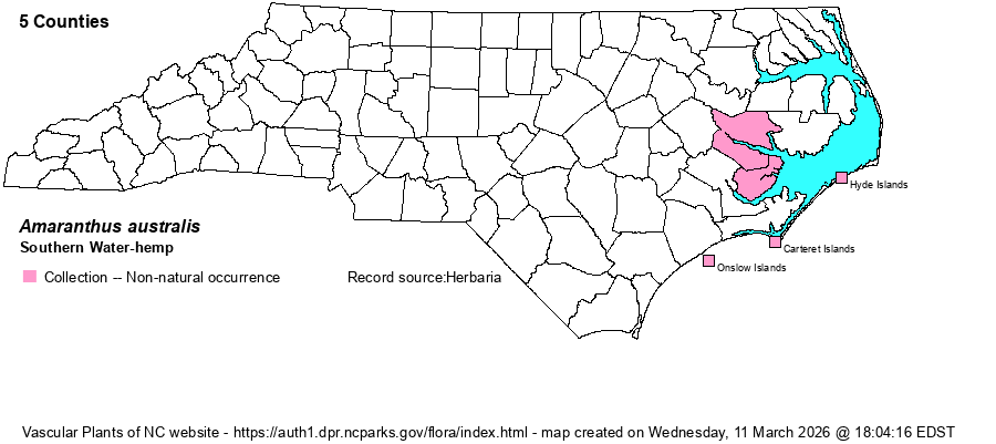 | Identification | Southern Water-hemp is much like the more common Saltmarsh Water-hemp (A. cannabinus), but may grow even taller -- plants on Ocracoke Island (Hyde County) can reach 11 feet tall! Technically, the floral bracts are more than 1 mm long in A. australis versus less than 1 mm long in that native species, and the bract midribs are usually strongly projecting (vs. scarcely so in A. cannabinus). | |