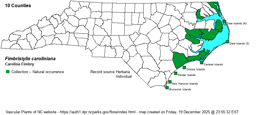 | Identification | This is a robust fimbry, with the stems potentially up to 4 feet tall but usually half that (which is still much taller than most others in the state). It is very similar to F. castanea, but its leaves are relatively thin and flat or V-shaped in life (vs. thick and semicircular in cross-section in F. castanea) and its seeds are less than 1.5 mm long (vs. 1.5-2 mm long in that species). | |