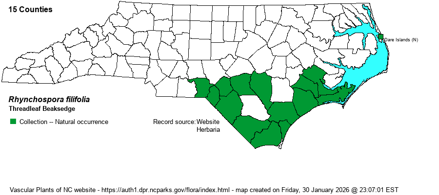 | Identification | NC has two similar, skinny beaksedges of Carolina bays and natural depression ponds: this one and R. perplexa. The latter differs in the horizontal ridges on the seeds and a short blunt beak, versus smooth seeds and a long sharp beak in R. filifolia. | |