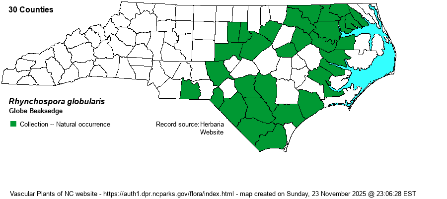 | Identification | Rhynchospora recognita and R. pinetorum have been split off from R. globularis. R. recognita differs in having longer seeds (1.4-1.8 mm vs. 1.3-1.5 mm) and wider leaves (up to 5 mm wide vs. up to 3 mm wide in R. globularis). R. pinetorum differs in having the seed bristles at least 2/3 the length of the seed body, versus usually less than 1/2 the length of the seed body in R. globularis. | |