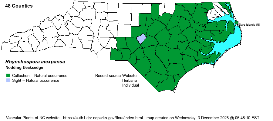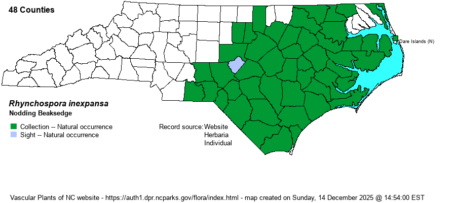 | Identification | Nodding Beaksedge is often noticed because it may form rather dense groups of plants. Individual stems are normally 2-4 feet tall, but upper halves almost always arch over, causing some/most spikelet clusters to droop. The seeds are unique in having a narrowly elliptical body and a long tapering beak. It is likely to be found in disturbed places as opposed to pristine natural areas. | |