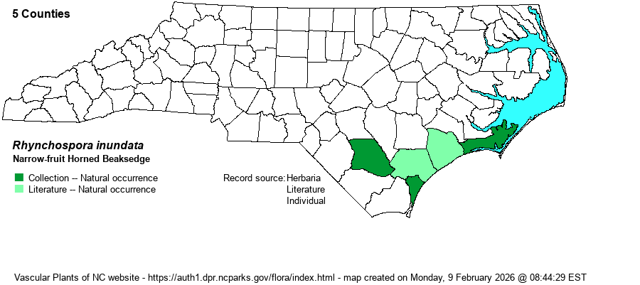 | Distribution | Outer Coastal Plain, plus Bladen County. Only verified specimens have been mapped, plus likely reports from Onslow and Pender counties (Richard LeBlond). A specimen from Brunswick County (Morris 082505-09 NCU) is actually R. macrostachya. Reports at NCNHP from Hoke, Robeson, and Scotland counties are actually R. careyana from clay-based Carolina bays.