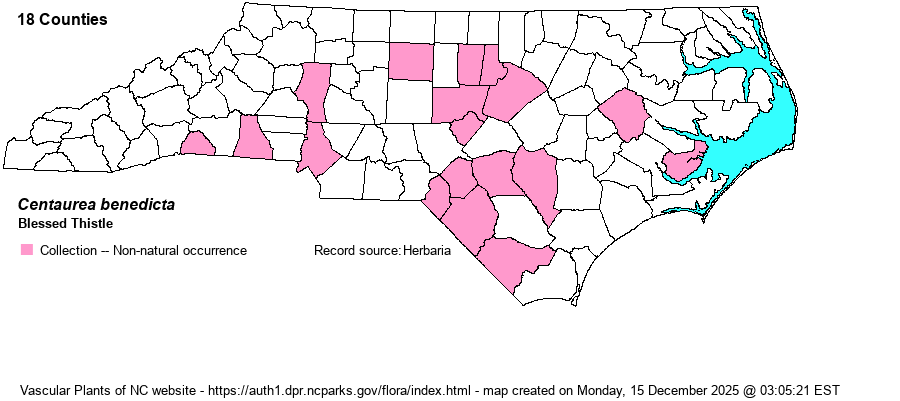 | Identification | Blessed Thistle has yellow flower heads surrounded at the base by ovate bracts (phyllaries). The plants grow 1-2 feet tall, the foliage essentially divided like thistles and the lobes being weakly spiny. The sessile and larger heads separate it from C. solstitialis. | |
