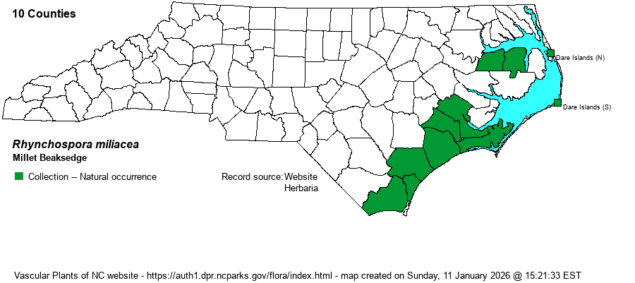 | Identification | The stems are about 2.5 feet tall, with an open inflorescence that has a unique aspect: branches are long (3-5 cm) and slender and oriented generally horizontally. Each branch has a few to several branchlets near the tip, on which a single spikelet grows. Among our beaksedges, only R. mixta has an inflorsecence vaguely like it, but it is poorly developed by comparison. Seeds of R. mixta have a tall triangular beak (vs. squat and with a short central point in R. miliacea). | |