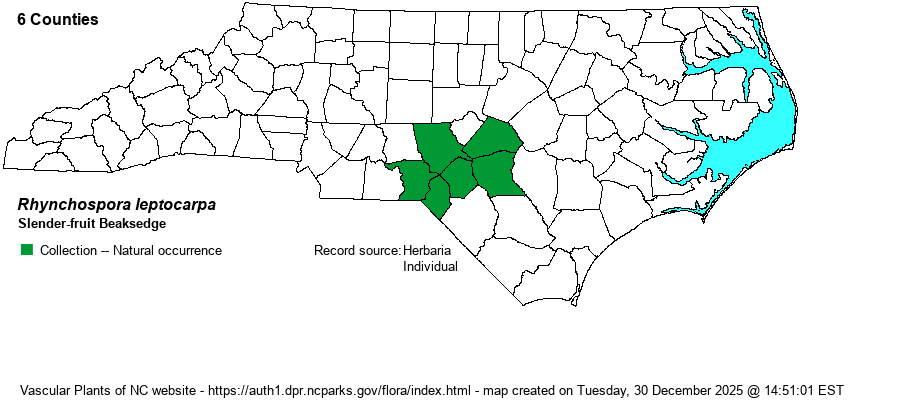 | Rhynchospora leptocarpa | < | Rhynchospora capitellata | Flora of North America (1993b, 1997, 2000, 2002a, 2002b, 2003a, 2004b, 2005, 2006a, 2006b, 2006c, 2007a, 2009, 2010) | | | Rhynchospora leptocarpa | < | Rhynchospora capitellata | Godfrey and Wooten (1979, 1981) | | | Rhynchospora leptocarpa | < | Rhynchospora capitellata | Kartesz (1999) | | | Rhynchospora leptocarpa | < | Rhynchospora capitellata | Radford, Ahles, and Bell (1968) | | | Rhynchospora leptocarpa | < | Rhynchospora capitellata | Goetghebeur in Kubitzki (1998b). Distributions given for tropical America are largely derived from Thomas (1992). | | | Rhynchospora leptocarpa | = | Rynchospora leptocarpa | Small (1933, 1938) | | | Source: Weakley's Flora |