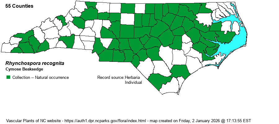 | Abundance | Frequent throughout he Coastal Plain and Piedmont, uncommon in the Mountains. The website editors recommend a State Rank of S5, one of the few beaksedge species in NC that are worthy of being considered at that abundance level. | |