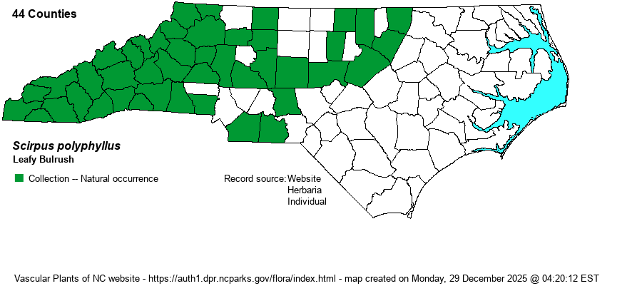 | Identification | The stems are 3-4 feet tall, with a diffusely branched (spreading) inflorescence that is tan or straw-colored (vs. much darker in S. georgianus and S. hattorianus). The stems have 14-22 leaves (vs. 12 or fewer leaves in the two species just named). It also resembles S. expansus, but Leafy Bulrush lacks the red banding on the stem leaf sheaths that are easily visible on S. expansus stems. | |