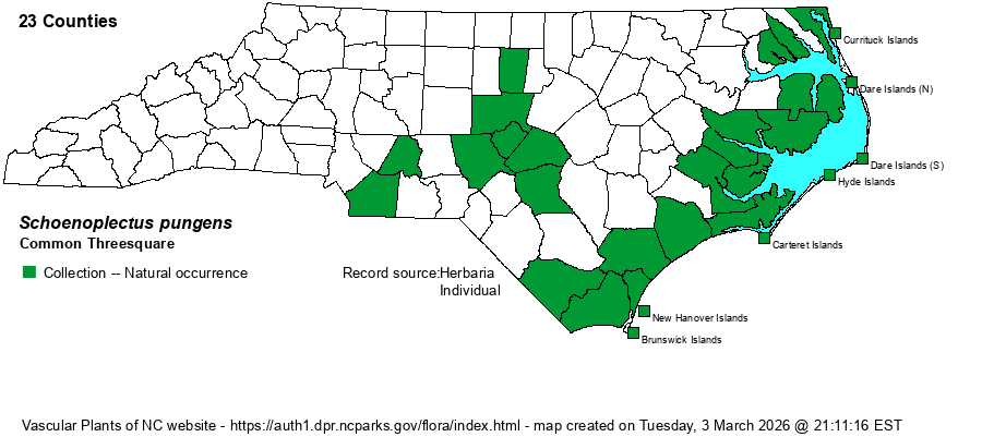 | Taxonomic Comments | Due to misidentification of the type specimen, Scirpus americanus needed a new name and Schoenoplectus pungens is it. Weakley (2025) lists var. pungens as the taxon present in NC.