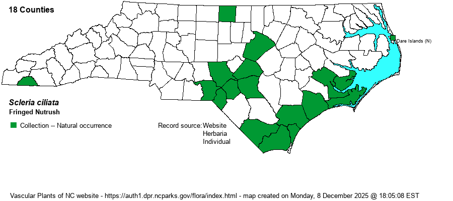 | Distribution | Scleria ciliata is now understood to include var. ciliata and var. glabra as synonyms. The former S. ciliata var. elliottii, as shown in Weakley (2018), has now been elevated to full species status, as S. elliottii (according to Richard LeBlond and Bruce Sorrie).