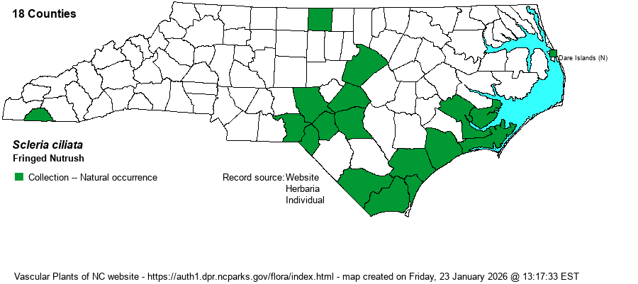 | Distribution | Scleria ciliata is now understood to include var. ciliata and var. glabra as synonyms. The former S. ciliata var. elliottii has now been elevated to full species status, as S. elliottii, according to Richard LeBlond and Bruce Sorrie and accepted by Weakley et al. (2025).
