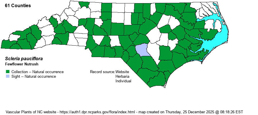 The genus Scleria, named as nutrushes, is a group of sedges notable for the white, often glossy, achenes (seeds) and tough, knotty, horizontal rhizomes (absent in S. verticillata, S. muehlenbergii, and S. reticularis). Stems are 1-many per plant, terminated by inflorescences of 1-several spikelets, subtended by leafy bracts. In some species there are also inflorescences produced from upper and middle stem leaf axils, these usually on long arching stalks. A dissecting scope is necessary to examine the achene for shape, ornamentation (bumps, pits, ridges), and hairs. Just as important are features of the hypogonium, upon which the achene tightly sits: present or not, how many lobes, and ornamentation (bumps, sharp points, etc.). | |
