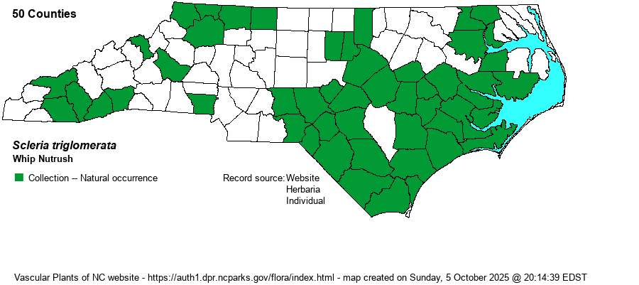 Scleria triglomerata | < | Scleria triglomerata | Gleason and Cronquist (1991) | | Scleria triglomerata | < | Scleria triglomerata | Flora of North America (1993b, 1997, 2000, 2002a, 2002b, 2003a, 2004b, 2005, 2006a, 2006b, 2006c, 2007a, 2009, 2010) | | Scleria triglomerata | < | Scleria triglomerata | Godfrey and Wooten (1979, 1981) | | Scleria triglomerata | < | Scleria triglomerata | Kartesz (1999) | | Scleria triglomerata | < | Scleria triglomerata | Radford, Ahles, and Bell (1968) | | Scleria triglomerata | < | Scleria triglomerata | Small (1933, 1938) | | Scleria triglomerata | < | Scleria triglomerata | Wofford (1989) | | Scleria triglomerata | < | Scleria triglomerata | Wunderlin & Hansen Flora of Florida (3) | | Scleria triglomerata | < | Scleria triglomerata | Flora of West Virginia | | Scleria triglomerata | < | Scleria triglomerata | LeBlond, Tessel, & Poindexter (2015). | | Source: Weakley's Flora |