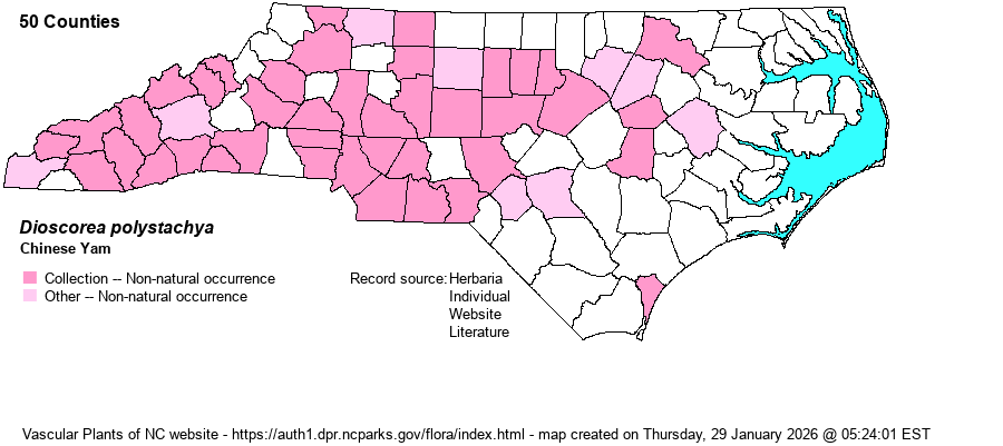 | Identification | This is a climber, potentially to 15 feet. Chinese Yam's leaves are shaped differently than our two native species (D. quaternata and D. villosa): each margin is concave at the transition from basal lobe to the terminal portion of the leaf (vs. continuously convex). The leaves tend to have more deeply sunken veins than on the native species. The fruits are like tiny potatoes. | |
