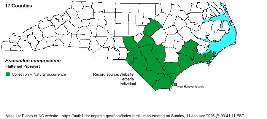 | Identification | This is one of two tall/robust pipeworts in NC, along with E. decangulare. This species has one or several flowering scapes that can reach 1-1.5 feet tall. The many basal leaves are only about 4 inches long and 1/4-inch wide, rather thin in texture. The single head atop each scape is bright white, composed of many tiny white flowers, with the head about 1/2-inch across. The rather flat-topped heads are soft and are easily compressed within your fingers when squeezed. The similar and more common E. decangulare has a very hard head of flowers; when squeezed between two fingers, the head is indeed hard and cannot be easily compressed. Both species can grow together locally, such as beaver ponds, but ordinarily do not occur together in the same habitats. | |
