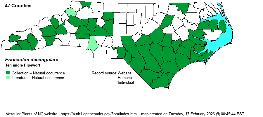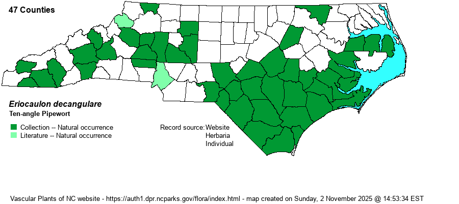 | Abundance | Common in the southern half of the Coastal Plain, but rare to uncommon in the northern half. Rare to uncommon in the Mountains and western half of the Piedmont, and very rare at best in the eastern half of the Piedmont. This is, by far, the most numerous of the state's five Eriocaulon species. | |
