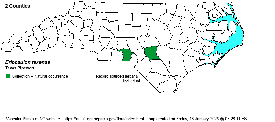 | Distribution | Known only from a few sites in the Sandhills -- from Richmond and Cumberland counties. This species was discovered in the state after RAB (1968) was published, during rare plant surveys of Fort Bragg. A specimen from Lake Ellis Simon in Craven County (at NCSC) needs careful ID; it likely is E. aquaticum.