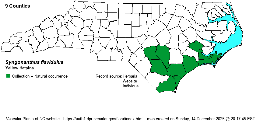 | Identification | Though this species is in a different genus than the other eight species of hatpins/pipeworts/bogbuttons in the family Eriocaulaceae, it nonetheless looks somewhat similar to many others and must be carefully identified owing to it being uncommon and a Watch List species. This species has numerous linear basal leaves, reaching about 3 inches tall and linear, but stiff and somewhat blue-green in color, with the base notably wider and flared. The several flowering scapes are different from the others in that the hairs are glandular and thus should feel somewhat sticky to the touch. Each one ranges to about 8 inches tall, and the single head is somewhat flattened in shape, much wider than high and disk-shaped, about 5.5-8 mm (about 1/4-inch) long. The head is typically somewhat cream-colored, to very pale yellow, but the common name is a misnomer, as the flowers are nowhere near yellow in color. | |