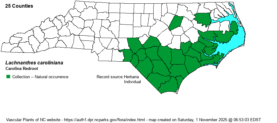 | Taxonomic Comments | This is a monotypic genus, with no other Lachnanthes species. There has been confusion or controversy about the specific epitaph spelling. Weakley (2018) mentions that it was originally written as "caroliana" when described, but this seems to be a spelling error that is correctable. So, some references use L. caroliana but apparently L. caroliniana is the correct spelling, as so many other species are named with this epitaph.