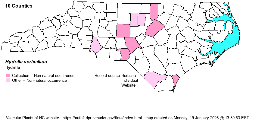 | Distribution | So far, mostly lower Piedmont and Sandhills; disjunct to Columbus and New Hanover counties. First collected in NC in 1980. Specimens from Nash County (at NCU) are Egeria densa. This species is spread from bodies of water on boat propellers, and probably on the legs of waterfowl, and thus certainly occurs in other counties now.