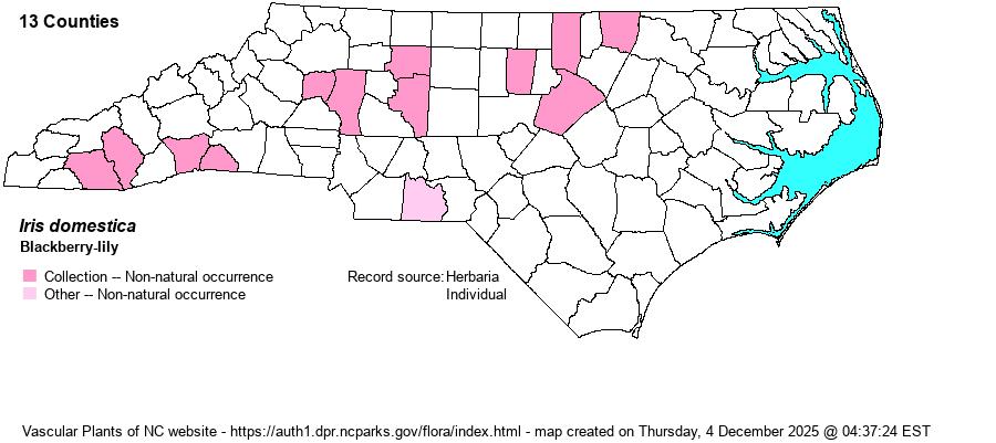 | Iris domestica | = | Belamcanda chinensis | Gleason and Cronquist (1991) | | | Iris domestica | = | Belamcanda chinensis | Fernald (1950) | | | Iris domestica | = | Belamcanda chinensis | Flora of North America (1993b, 1997, 2000, 2002a, 2002b, 2003a, 2004b, 2005, 2006a, 2006b, 2006c, 2007a, 2009, 2010) | | | Iris domestica | = | Belamcanda chinensis | Gleason (1952) | | | Iris domestica | = | Belamcanda chinensis | Kartesz (1999) | | | Iris domestica | = | Belamcanda chinensis | | | | Iris domestica | = | Belamcanda chinensis | Radford, Ahles, and Bell (1968) | | | Iris domestica | = | Belamcanda chinensis | Small (1933, 1938) | | | Iris domestica | = | Belamcanda chinensis | Wofford (1989) | | | Iris domestica | = | Belamcanda chinensis | Flora of West Virginia | | | Source: Weakley's Flora |