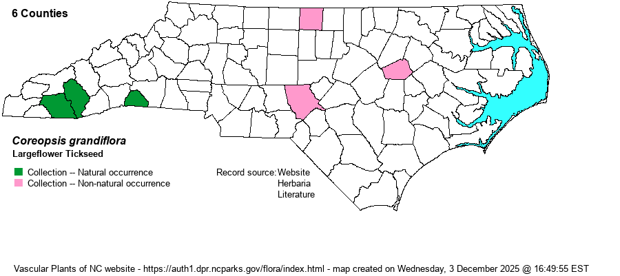 | Distribution | Southern Mountains as a native taxon; Piedmont and Coastal Plain as a non-native taxon. To date, found in only Caswell, Jackson, Macon, Moore, and Wilson counties. A specimen from Polk County (Melrose Mountain) is not visible for viewing on SERNEC, but the range and presumed habitat seem suitable for a natural site. Collections from other counties are likely misidentifications or introductions. The many reports on iNaturalist from downstate are not included on the map, owing in part to uncertainty of identification and partly to uncertainty of local provenance, though certainly none refer to natural/native populations.