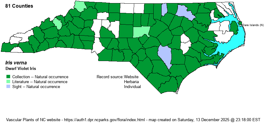 | Other Common Name(s) | Dwarf Iris is the most frequent common name. However, I. cristata is a dwarf iris and is usually called Dwarf Crested Iris or Crested Dwarf Iris. Thus, "Dwarf Iris" becomes a nested name and is not suitable for a common name for I. verna. Several sites use Dwarf Violet Iris, which the website uses. | |