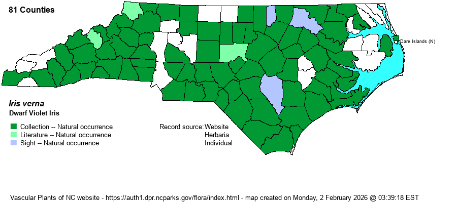 | Distribution | Found essentially statewide, but as with hundreds of other species, it is scarce to locally absent close to the northeastern coast. Note that there are two varieties in the state, neither being scarce -- var. smalliana being the one in the Mountains and western Piedmont, and the nominate var. verna occurring in the eastern 2/3rds of the state. There may be a narrow gap in the range between these two, in the central Piedmont.
