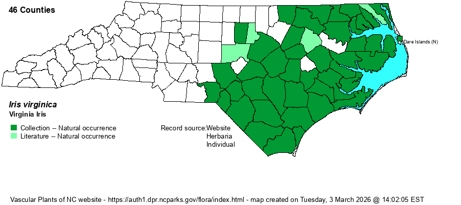 | Identification | This is the most common tall iris in the state and is usually the species one thinks of when "iris" is mentioned. For an iris it has broad leaves, often glaucous green, with the sword-like leaves being up to 2-3 feet long and about 1.5 inches wide; one leaf edge is pointed toward the flowering stem, as in all irises. The flowering stem is 2-2.5 feet tall, rarely to 3 feet tall. Each stem is generally unbranched but has a few flowers, generally only one blooming at a time. The flowers, up to 3-4 inches high and wide, are violet-blue in color, with some white and yellow on the sepals. The shorter petals are quite erect and about 1-1.5 inches tall. In the similar I. tridentata, the 3 petals are very short and barely extend to the claw of the sepals. The range does not quite overlap with the more western I. shrevei, which is very similar but has a taller flowering stem (often to 3 feet high), usually one or two branches on the stem, and has larger capsules (about 4 inches long compared with 2-3 inches in I. virginica). It is normally not hard to spot a stand of Virginia Iris when you are driving along roads in the lower Coastal Plain, such as along the margins of canals and in ditches. | |