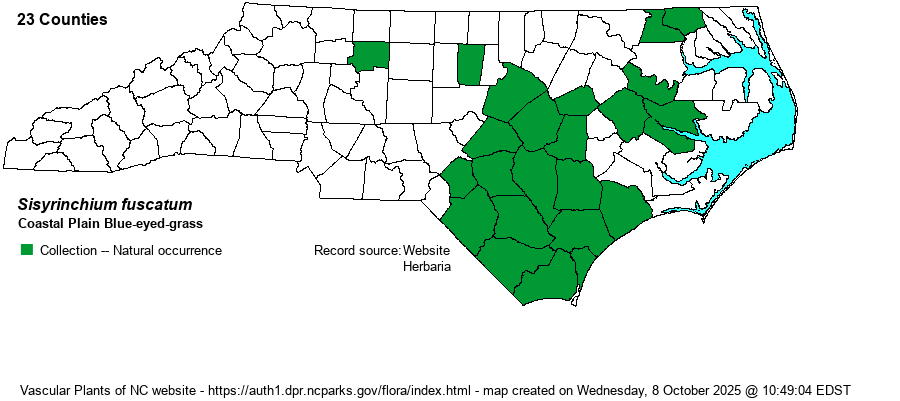 Habitat | This blue-eyed-grass occurs in drier and sandier habitats than all others in the state except some S. rufipes. It grows on sand barrens, sandy rims of Carolina bays, and other sandy pine woods and openings. However, it rarely can occur in flatwoods and drier parts of savannas. | |