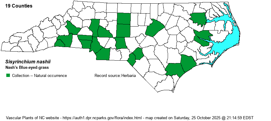 | Taxonomic Comments | This taxon has an odd history! There are many other old Sisyrinchium names used for it. However, the truth can be told from the labels on many of the specimens at the UNC Herbarium. In 1986, a number of the original S. angustifolium specimens were re-examined by K. Hornberger, and re-named as S. nashii. The mystery as to which map in RAB (1968) the S. nashii records were included has now been solved. (Note that S. angustifolium is found in probably every county in the state, and thus the dots delineating the range for S. nashii are not evident.)