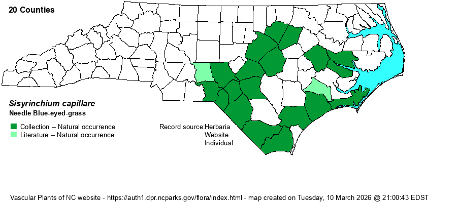 | Abundance | Uncommon to infrequent in the NC range, but may be locally numerous in some managed areas near the coast. Rare in the eastern edge of the Piedmont. It is likely that many species of blue-eyed-grasses have been under-collected in the state, as range maps for many are not solidly populated but have many holes, such as seen on this species' map. | |