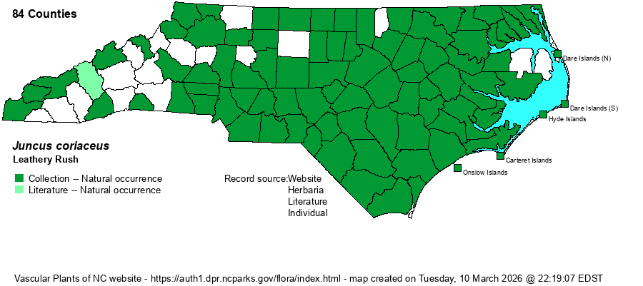 | Identification | Leathery Rush is much like the ubiquitous Soft Rush (J. effusus) in having the inflorescence appear to be lateral and well below the tip of the stem. However, the inflorescence is smaller and fewer-flowered, the capsules are more rounded (vs. subglobose at most), and the stems narrower and not as soft. | |
