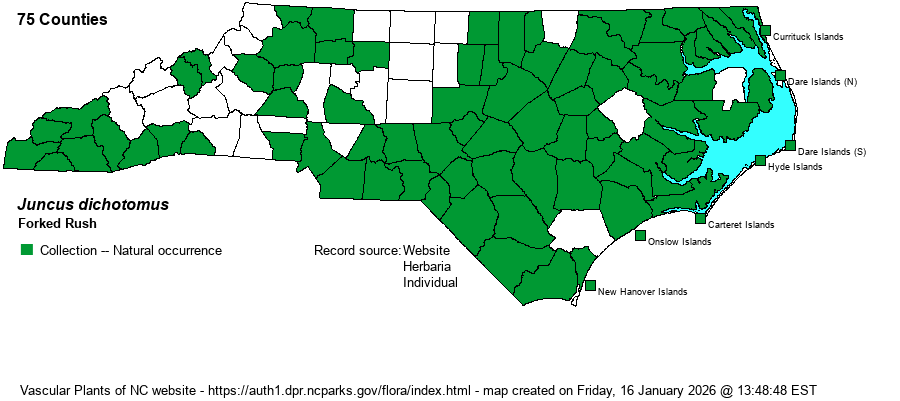 | Identification | Forked Rush typically grows 1-2 feet tall, several stems together. Leaves are all basal or near-basal, slender, and vary from round in cross-section to rather flat. The inflorescence is terminal and short-branched, with a few to several heads generally crowded on each branch. Three other species in NC look very similar. Path Rush (J. tenuis) has a long, tongue-like auricle (extension) at the tip of each leaf sheath (vs. short). In Georgia Rush (J. georgianus) and Lopsided Rush (J. secundus) the lowest involucral bract (at the junction of the stem and inflorescence) is shorter than the inflorescence (vs. usually longer); note also their specialized habitats. | |