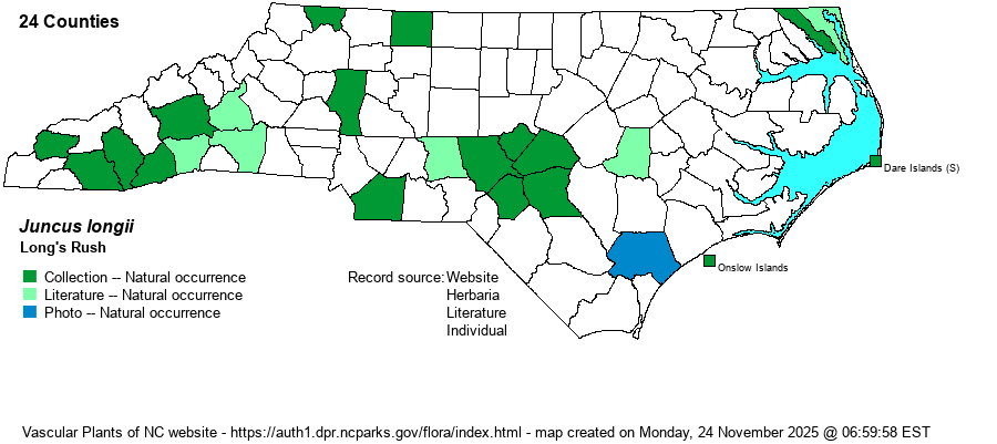 | Identification | Long's Rush is very like Bog Rush (J. biflorus) in height and in having flat leaf blades, has a more compact inflorescence (often densely so), and has narrower, much longer, horizontal rhizomes. From Grassleaf Rush (J. marginatus) it is taller, has wider leaves, and fewer flowers per head. See Knapp and Naczi (2008) for details of this often-overlooked species and its close relatives. | |