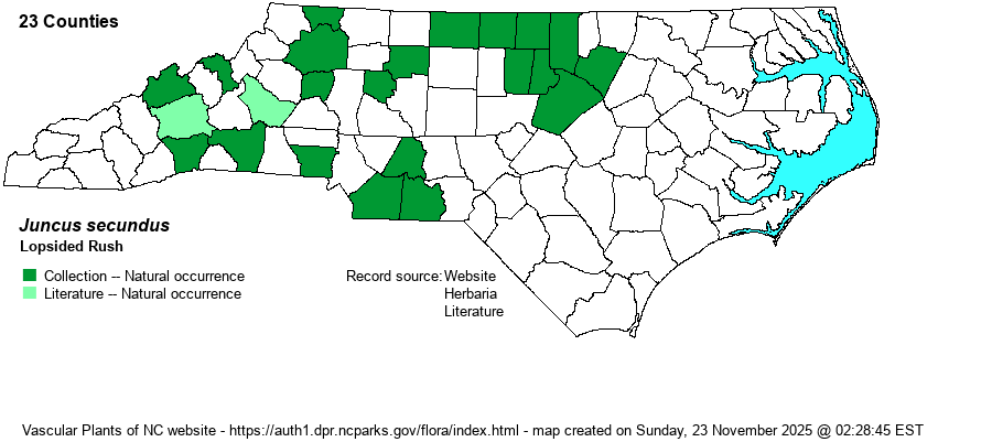 | Identification | Lopsided Rush is very similar to the ubiquitous Path Rush (J. tenuis), but the lowest involucral leaf is shorter than the inflorescence and the leaf sheath auricle is very short (vs. prolonged). It is closely related to Georgia Rush (J. georgianus), but Lopsided Rush has shorter tepals (2.5-3.5 mm versus 3.6-5.1 mm in that species) and broader capsules (ellipsoid to globose vs. ellipsoid to narrowly ellipsoid). Both species may have heads arranged along one side of a branch (secund), apparently always in Lopsided Rush. | |