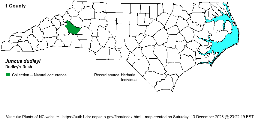 | Distribution | The only credible records in NC for this species of calcareous and circumneutral soils are from Linville River in Burke County, discovered by Tom Govus in 2005 (pers. com. to Weakley). A voucher specimen from Linville River at herbarium APSC appears to be J. dudleyi; it was collected in 2014 by Devin Rodgers. Specimens in SERNEC from Bladen and Harnett counties in the Coastal Plain are from "abandoned field" and "roadside ditch", and are misidentified.
