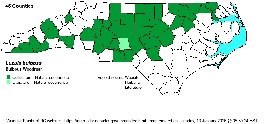 | Identification | Bulbous Woodrush rarely exceeds a foot tall. Like L. echinata and L. multiflora, most leaves are basal and near-basal and wispy-hairy, and the inflorescence has rather short branches. Each head contains 6-20 flowers and is longer than wide. Bulbous Woodrush and Common Woodrush (L. multiflora) have strongly ascending or erect branches, versus often spreading on longer branches in Hedgehog Woodrush (L. echinata). The characteristic, whitish bulblets occur on some roots, but are not always present. | |