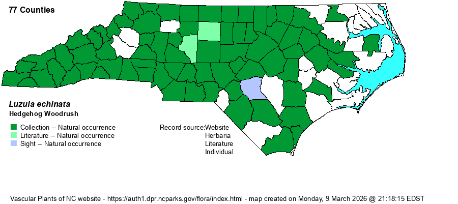 | Identification | Hedgehog Woodrush rarely exceeds a foot tall. Like L. bulbosa and L. multiflora, most leaves are basal and near-basal and wispy-hairy, and the inflorescence has mostly short branches. Each head contains 8-16 flowers and is as long as wide, occasionally a bit longer than wide. Bulbous Woodrush (L. bulbosa) and Common Woodrush (L. multiflora) have strongly ascending or erect branches (vs. often spreading on longer branches in Hedgehog Woodrush) and heads are longer than wide. | |
