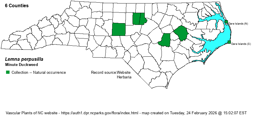 | Abundance | Weakley's (2018) map indicates it is "common" in the Coastal Plain but "rare" in the Piedmont. Note that the NHP database does not have Lemna aequinoctialis, L. minor, and L. obscura pulled out of L. perpusilla (broad sense); thus, they simply ranked the broad sense L. perpusilla as S4. In reality, the "new" L. perpusilla (strict sense) may well be less common than that, and so tentatively the website editors have assigned a state rank of S3? until more information is available. Though only six county records show on the map, the fact that Weakley considers it as common in the NC Coastal Plain suggests that it may well be as numerous as an S4 rank. | |