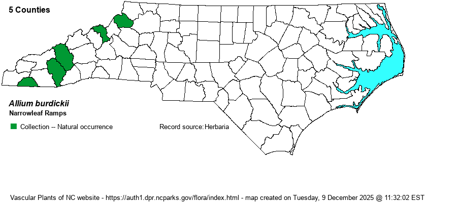 | Distribution | This species (or taxon) is known from several SERNEC collections made over five montane counties. As it looks similar to the locally common Red Ramps (A. tricoccum), with which it is often included as a variety, it can certainly be overlooked or misidentified. Thus, it is tentatively known to occur only in the Mountains, at higher elevations.