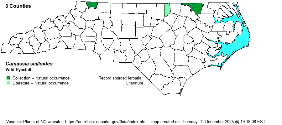 The species is essentially one of the Mississippi and Ohio drainages. It ranges from western PA west to IA, and south to southern AL and central TX. There are only scattered records east of the Appalachians, essentially in NC and SC. In fact, there is a very large population in the York and Chester counties area of northern SC, in the well-known "Camassia Flats", which is odd considering there are no records from the southern or central portions of NC. | |