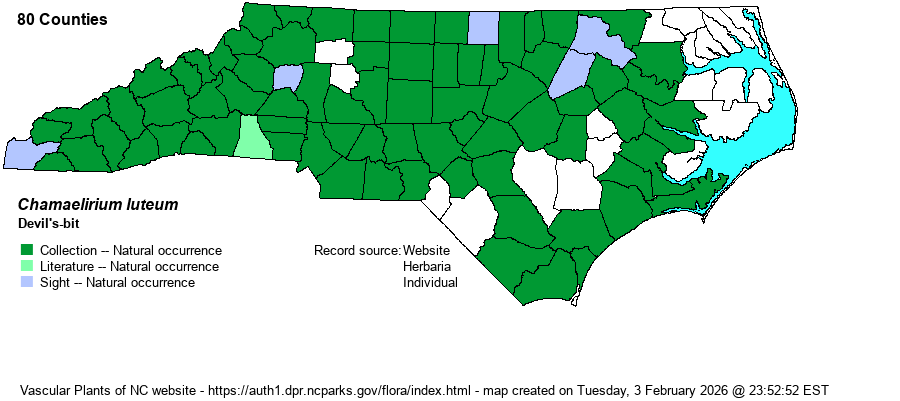 | Identification | This is a lily with a basal rosette of several evergreen leaves. The leaves are spatulate (much wider above the middle) and rounded at the tips, averaging about 5 inches long and 1.5 inches wide. The flowering stalks differ by the sexes (a rare herbaceous plant with separate sexes); male stalks grow to about 2 feet tall, whereas the female stalks are a bit taller, to about 2.5-3 feet tall. In addition, the stalks contain smaller leaves that are reduced farther upwards. The male spike of dense and very small white flowers averages about 5 inches long, and this spike droops at the tip when mature. The female spike eventually reaches 8 inches or more, and it remains erect; it also has very small white flowers. As a rule, most of the plants in a population are the male (staminate) ones, with female (pistillate) plants more scattered and not quite as showy or densely white-flowered. Nonetheless, the plants can be seen at long distances near the forest floor when in bloom. As with many plants having evergreen leaves in a rosette, biologists often run across such "rosette" plants with a cluster of dark green leaves on a winter or very early spring walk. This species tends to have a bit longer and more spatulate leaves than some others, but identifications of plants with only basal leaves visible must be made with care, especially vs. Carphephorus bellidifolius. Thankfully, it is fairly widespread over most of the state, and you should see the species at least a few times in a spring or summer season. | |